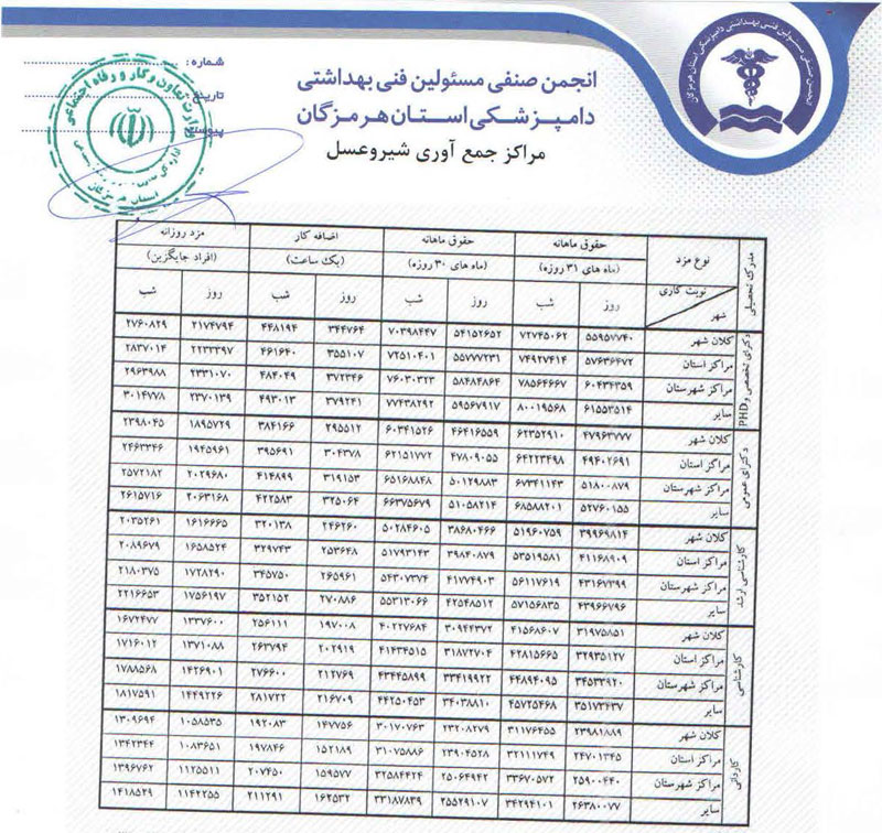 به گزارش انجمن دامپزشکی تهران، در پی استعلام انجمن صنفی مسئولین فنی و ناظرین بهداشتی دامپزشکی استان هرمزگان، اداره کل تعاون، کار و رفاه اجتماعی استان هرمزگان حداقل حقوق و مزایای مسئولین فنی و ناظرین بهداشتی دامپزشکی در سال 98 را طی نامه ای تایید و ابلاغ کرد.